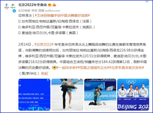 中工网讯 据北京2022年冬奥会和冬残奥会组织委员会官方微博消息,2月14日,北京2022年冬奥会花样滑冰冰上舞蹈自由舞的比赛在首都体育馆结束角逐,与韵律舞的成绩相加后,法国组合加布丽埃拉·帕帕达基斯/纪尧姆·西泽龙226.98分获得金牌,俄奥队组合维多利亚·西尼齐娜/尼基塔·卡察拉波夫220.51分获得银牌,美国组合麦迪逊·哈贝尔/扎卡里·多诺霍218.02分获得铜牌。中国组合王诗玥/柳鑫宇总分184.42获得第12名,刷新中国冰舞的历史最好成绩。