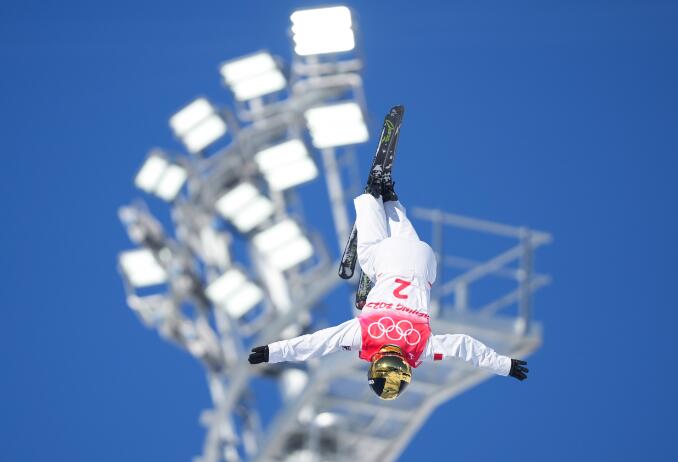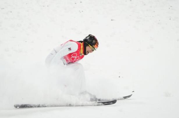 2月14日,中国选手孔凡钰在比赛中。当日,北京2022年冬奥会自由式滑雪女子空中技巧资格赛在张家口云顶滑雪公园举行。新华社记者 牟宇 摄