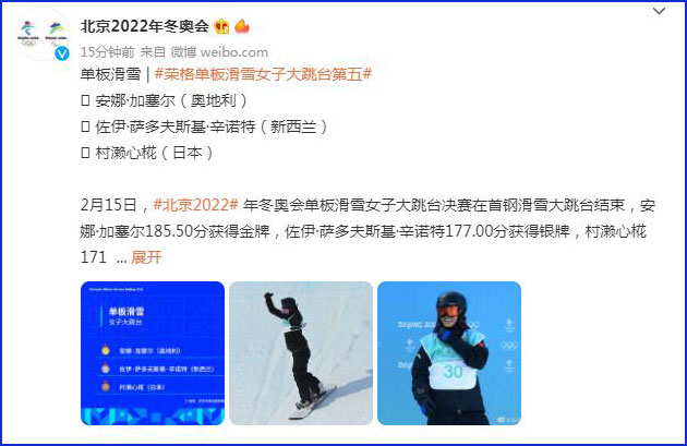 中工网讯 据北京2022年冬奥会和冬残奥会组织委员会官方微博消息,2月15日,北京2022年冬奥会单板滑雪女子大跳台决赛在首钢滑雪大跳台结束,奥地利选手安娜·加塞尔185.50分获得金牌,新西兰选手佐伊·萨多夫斯基·辛诺特177.00分获得银牌,日本选手村濑心椛171.50分获得铜牌。中国选手荣格166.00分获得第五名,创造中国队该项目冬奥最佳战绩。