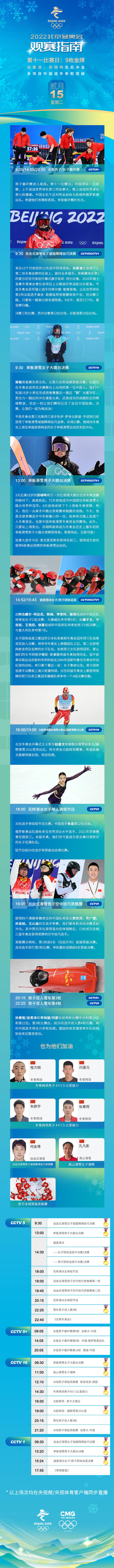 2月15日观赛指南:谷爱凌、苏翊鸣先后冲金 多项目中国选手争取突破