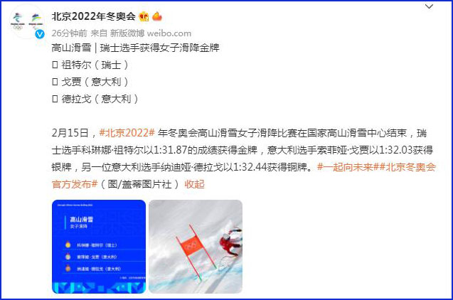 中工网讯 据北京2022年冬奥会和冬残奥会组织委员会官方微博消息,2月15日,北京2022年冬奥会高山滑雪女子滑降比赛在国家高山滑雪中心结束,瑞士选手科琳娜·祖特尔以1:31.87的成绩获得金牌,意大利选手索菲娅·戈贾以1:32.03的成绩获得银牌,另一位意大利选手纳迪娅·德拉戈以1:32.44的成绩获得铜牌。