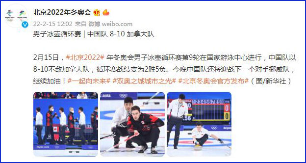 中工网讯 据北京2022年冬奥会和冬残奥会组织委员会官方微博消息,2月15日,北京2022年冬奥会男子冰壶循环赛第9轮在国家游泳中心进行,中国队以8-10不敌加拿大队,循环赛战绩变为2胜5负。今晚中国队还将迎战下一个对手挪威队。