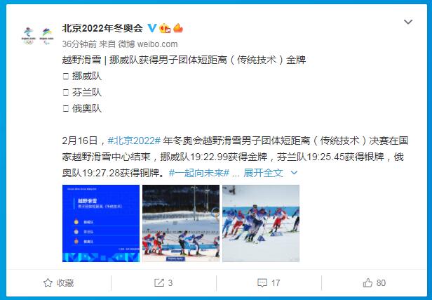 中工网讯 据北京2022年冬奥会和冬残奥会组织委员会官方微博消息,2月16日,北京2022年冬奥会越野滑雪男子团体短距离(传统技术)决赛在国家越野滑雪中心结束,挪威队19:22.99获得金牌,芬兰队19:25.45获得银牌,俄奥队19:27.28获得铜牌。