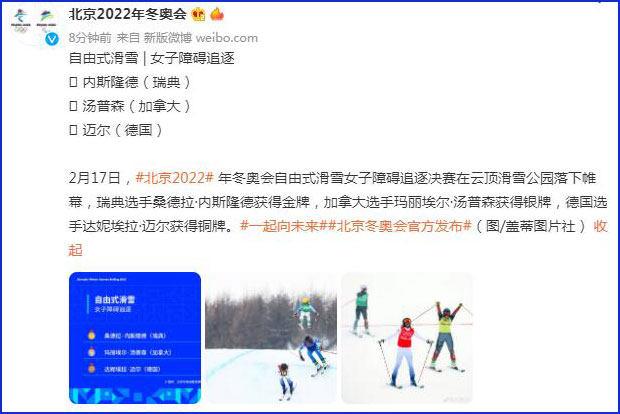 中工网讯 据北京2022年冬奥会和冬残奥会组织委员会官方微博消息,2月17日,北京2022年冬奥会自由式滑雪女子障碍追逐决赛在云顶滑雪公园落下帷幕,瑞典选手桑德拉·内斯隆德获得金牌,加拿大选手玛丽埃尔·汤普森获得银牌,德国选手达妮埃拉·迈尔获得铜牌。