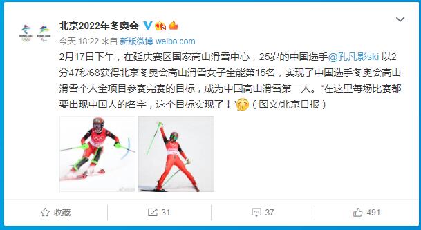 中工网讯 据北京2022年冬奥会和冬残奥会组织委员会官方微博消息,2月17日下午,在延庆赛区国家高山滑雪中心,25岁的中国选手孔凡影以2分47秒68获得北京冬奥会高山滑雪女子全能第15名,实现了中国选手冬奥会高山滑雪个人全项目参赛完赛的目标,成为中国高山滑雪第一人。