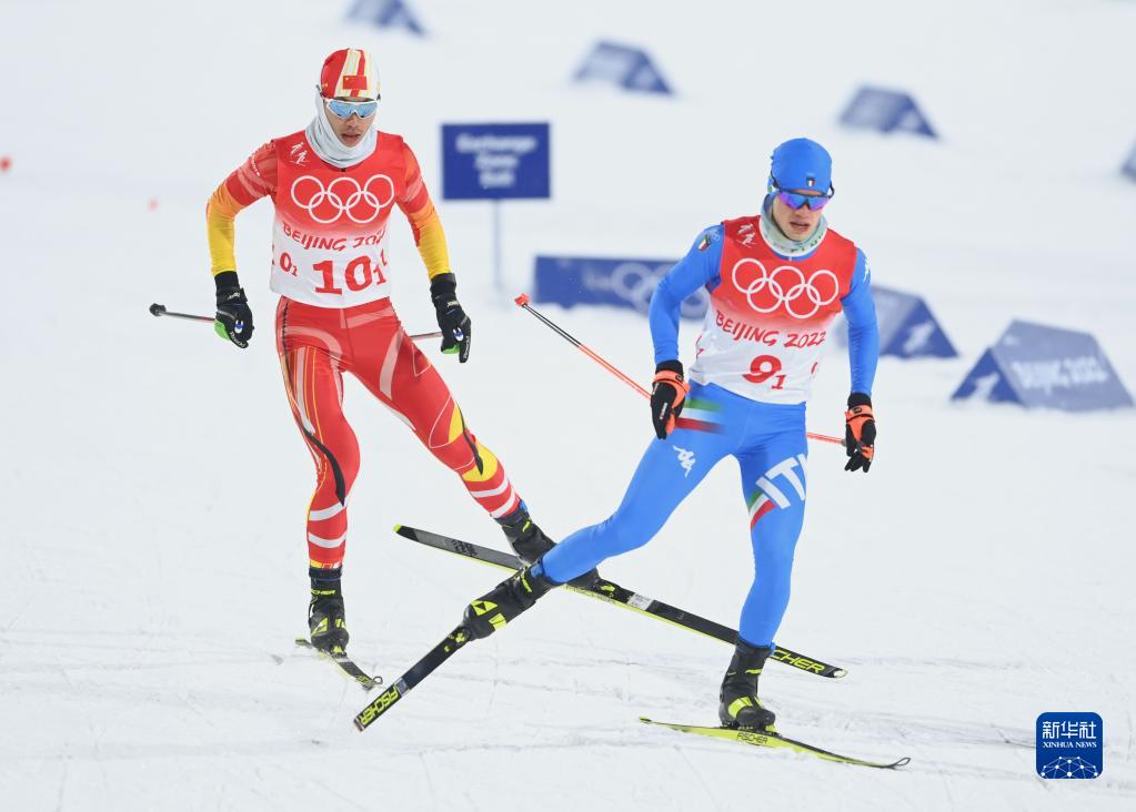 2月17日,中国队选手赵嘉文(左)与意大利选手雅各布·博尔托拉斯在越野滑雪比赛中。新华社记者 戴天放 摄