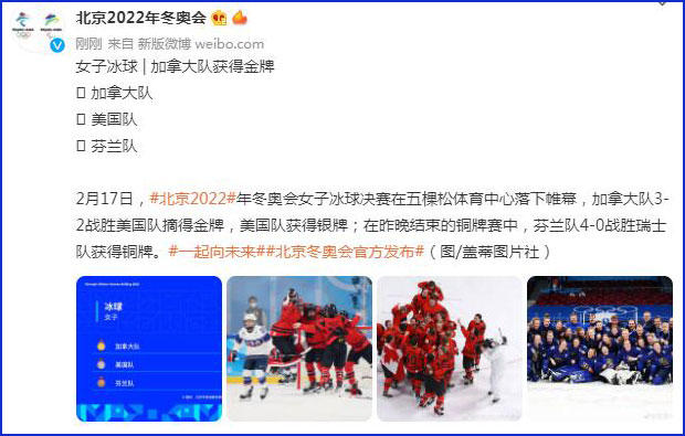 中工网讯 据北京2022年冬奥会和冬残奥会组织委员会官方微博消息,2月17日,北京2022年冬奥会女子冰球决赛在五棵松体育中心落下帷幕,加拿大队3-2战胜美国队摘得金牌,美国队获得银牌;在昨晚结束的铜牌赛中,芬兰队4-0战胜瑞士队获得铜牌。