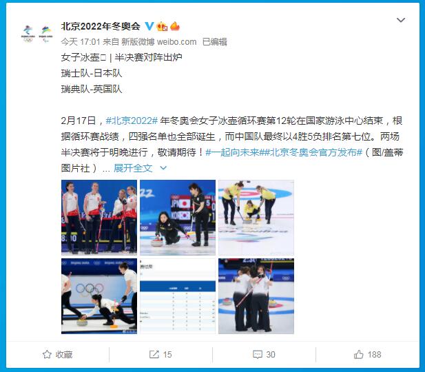 中工网讯 据北京2022年冬奥会和冬残奥会组织委员会官方微博消息,2月17日,北京2022年冬奥会女子冰壶循环赛第12轮在国家游泳中心结束,根据循环赛战绩,四强名单也全部诞生,而中国队最终以4胜5负排名第七位。