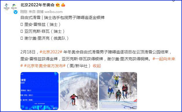 中工网讯 据北京2022年冬奥会和冬残奥会组织委员会官方微博消息,2月18日,北京2022年冬奥会自由式滑雪男子障碍追逐项目在云顶滑雪公园结束,瑞士选手里安·雷格兹获得金牌,瑞士选手亚历克斯·菲瓦获得银牌,俄奥队选手谢尔盖·里济克获得铜牌。