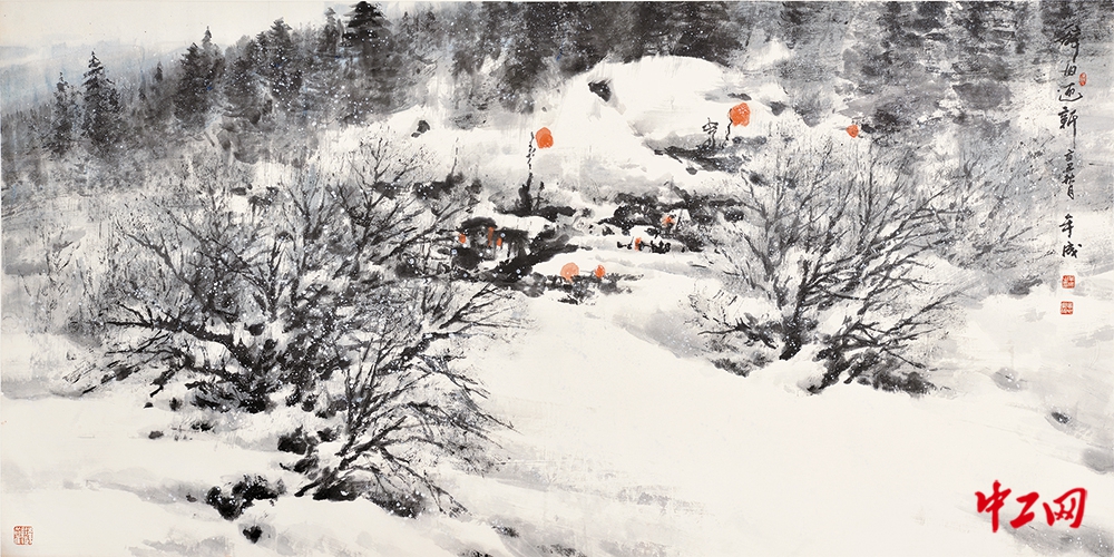 《辞旧迎新》(冰雪画,尺寸250cm×124cm),“冰雪情·冬奥梦”全国职工冰雪主题绘画活动特邀牟成先生作品