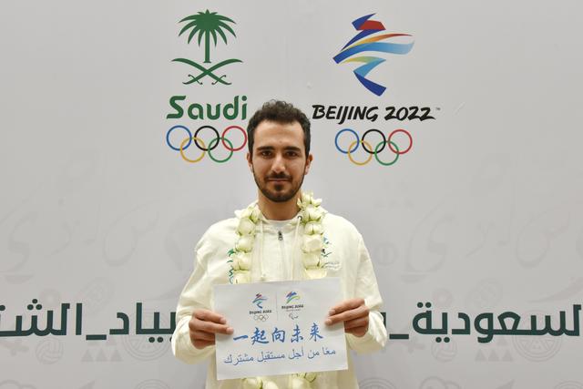 沙特高山滑雪运动员法伊克·阿卜迪手举“一起向未来”标语留影。新华社记者 王海洲 摄