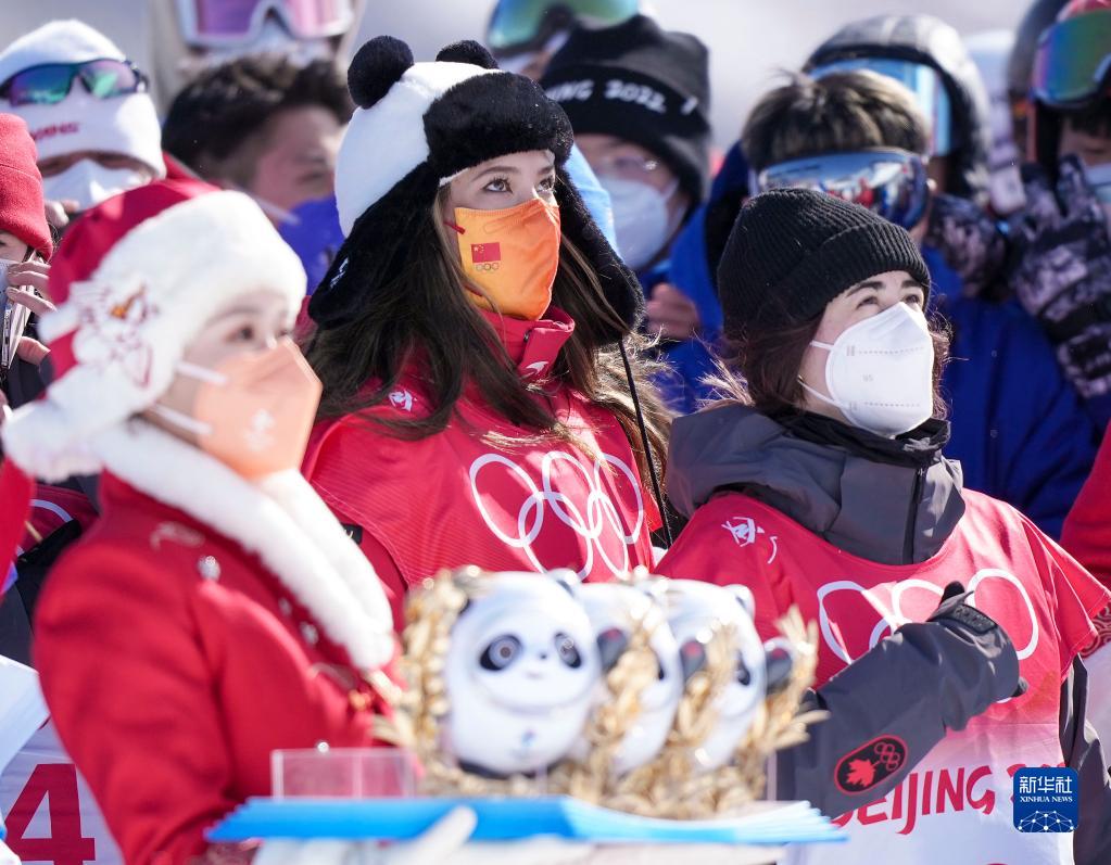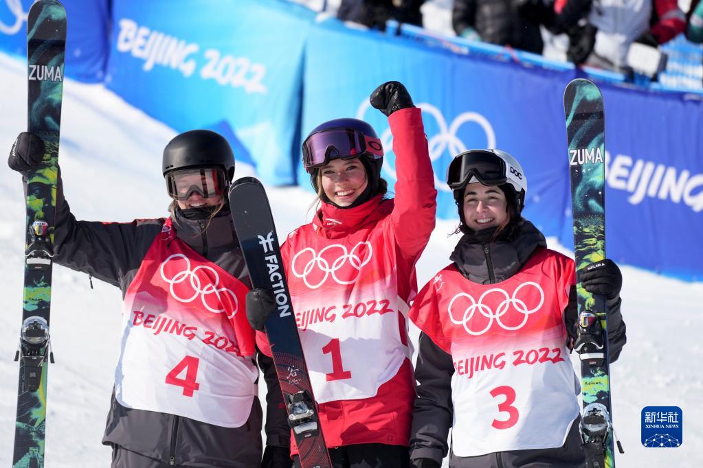 2月18日,获得冠军的中国队选手谷爱凌(中)、获得亚军的加拿大选手凯茜·夏普(左)和获得季军的加拿大选手蕾切尔·卡克在比赛后庆祝。