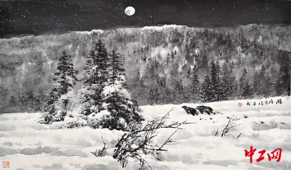 《皓月》(冰雪画,尺寸227cm×133cm),“冰雪情·冬奥梦”全国职工冰雪主题绘画活动特邀牟成先生作品