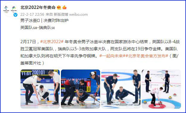 中工网讯 据北京2022年冬奥会和冬残奥会组织委员会官方微博消息,2月17日,北京2022年冬奥会男子冰壶半决赛在国家游泳中心结束,英国队以8-4战胜卫冕冠军美国队,瑞典队以5-3击败加拿大队,两支队伍将在19日争夺金牌。美国队和加拿大队则将在18日下午率先争夺铜牌。