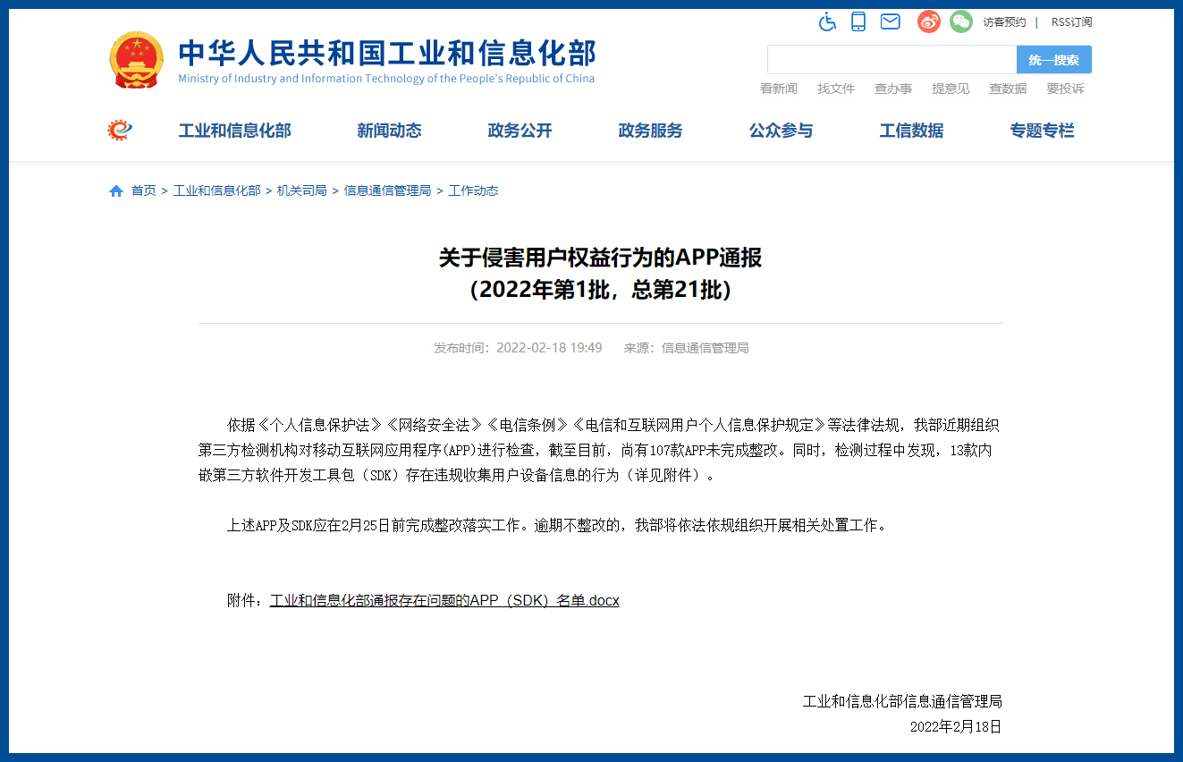 上述APP及SDK应在2月25日前完成整改落实工作。逾期不整改的,工信部将依法依规组织开展相关处置工作。