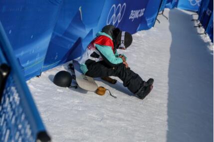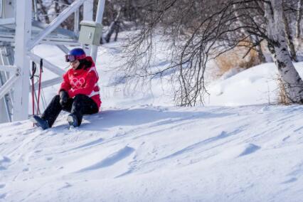 2月11日,张家口赛区,在北京冬奥会单板滑雪女子U型场地技巧决赛上,中国队选手蔡雪桐与领奖台仅一步之遥。赛后,她一个人坐在运动员通道。