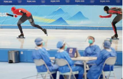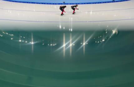 2月17日,北京冬奥会速度滑冰女子1000米决赛在国家速滑馆“冰丝带”进行。赛前,选手们正在进行热身。在“最快的冰”上,各国运动员已打破10项奥运纪录。