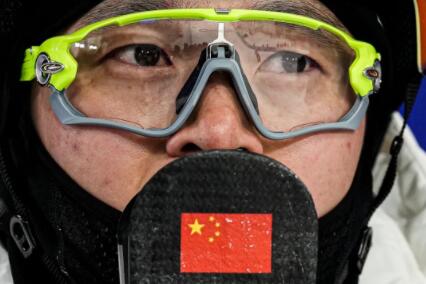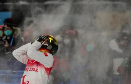 2月16日,北京冬奥会自由式滑雪男子空中技巧决赛在张家口赛区举行。中国队选手齐广璞在完成最后一跳后依着雪板等待成绩。当晚,作为冬奥会“四朝元老”的他终圆奥运冠军梦。