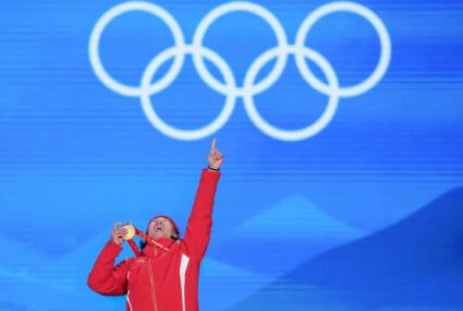 2月15日,北京冬奥会单板滑雪男子大跳台奖牌颁发仪式在北京赛区颁奖广场举行。获得中国代表团第6块金牌的苏翊鸣站上冠军奖台庆祝夺冠。