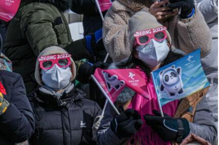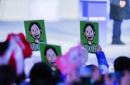 2月15日,在北京冬奥会北京赛区奖牌颁发仪式上,等运动员合影时,台下的志愿者举着“摘下口罩”的英文卡片提醒他们。北京冬奥会开幕前,国际奥委会和北京冬奥组委宣布,根据防疫手册要求,北京冬奥会奖牌得主在领奖时可以短暂摘下口罩并留影纪念。
