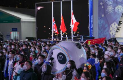 2月15日,在北京冬奥会北京赛区奖牌颁发仪式上,升国旗、奏国歌环节,“冰墩墩”与观众一起行注目礼。