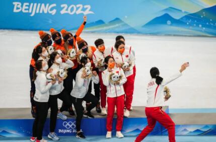 2月13日,首都体育馆,在北京冬奥会短道速滑项目女子3000米接力比赛的纪念品颁发仪式上,中国队选手邀请荷兰、韩国运动员合影留念。