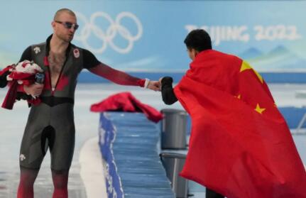 2月12日,在国家速滑馆举行的北京冬奥会速度滑冰男子500米决赛中,中国队选手高亭宇以34秒32的成绩打破奥运会记录获得金牌。赛后,一名加拿大运动员向高亭宇击拳祝贺。