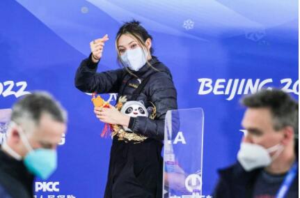 2月8日,北京首钢园,中国队选手谷爱凌在北京冬奥会自由式滑雪女子大跳台决赛中夺得冠军。在赛后的新闻发布会结束后,她向在场记者比心问候。
