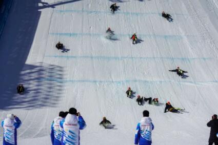 2月7日,张家口赛区云顶滑雪公园,观众正戴着墨镜观看北京冬奥会单板滑雪男子坡面障碍技巧决赛。