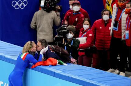 2月7日,首都体育馆,北京冬奥会短道速滑项目女子500米决赛中,意大利队选手阿里安娜·方塔纳夺得冠军后激动地和场边的丈夫兼教练小洛贝洛开心热吻。这枚金牌也让她成为史上第5位在冬奥会拿下至少10枚奖牌的传奇女将。
