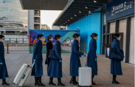2月7日,北京清河站,排队进站的“冬奥专列”列车员。贯穿于冬奥村的京张高铁智能动车组,是中国第一条采用自主研发的北斗卫星导航系统、设计时速为350公里/小时的智能化高速铁路。