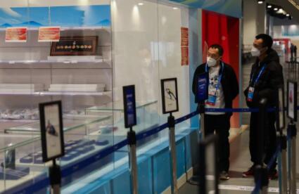2月6日,北京冬奥会主媒体中心内的冬奥会特许商品零售店,两名工作人员看着空空的货架。北京冬奥会吉祥物“冰墩墩”的"破冰"出圈让无数消费者感叹:一“墩”难求。