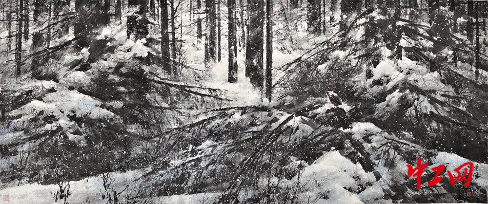 《逆风》(冰雪画,尺寸367cm×144cm),“冰雪情·冬奥梦”全国职工冰雪主题绘画活动特邀牟成先生作品