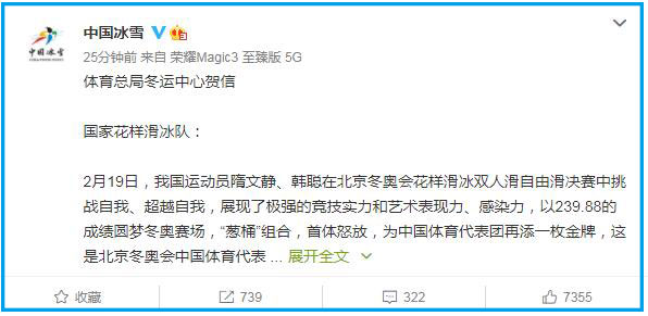 中工网讯 据中国冰雪官方微博消息,体育总局冬运中心祝贺隋文静、韩聪夺冠。贺信全文如下: