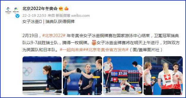 中工网讯 据北京2022年冬奥会和冬残奥会组织委员会官方微博消息,2月19日,北京2022年冬奥会女子冰壶铜牌赛在国家游泳中心结束,卫冕冠军瑞典队以9-7战胜瑞士队,摘得一枚铜牌。女子冰壶金牌赛将在20日上午进行,对阵双方为英国队和日本队。