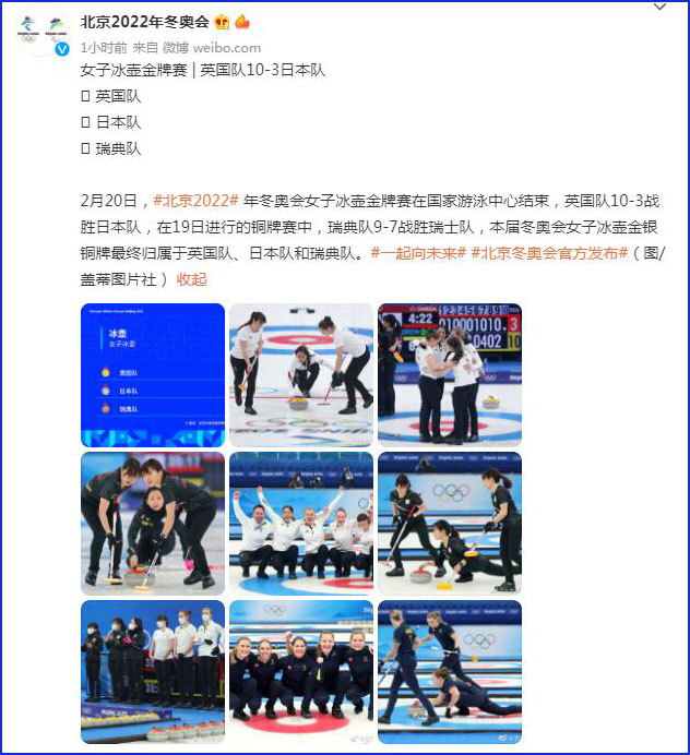 中工网讯 据北京2022年冬奥会和冬残奥会组织委员会官方微博消息,2月20日,北京2022年冬奥会女子冰壶金牌赛在国家游泳中心结束,英国队10-3战胜日本队,在19日进行的铜牌赛中,瑞典队9-7战胜瑞士队,本届冬奥会女子冰壶金银铜牌最终归属于英国队、日本队和瑞典队。
