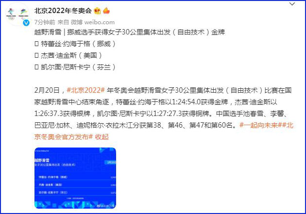 中工网讯 据北京2022年冬奥会和冬残奥会组织委员会官方微博消息,2月20日,北京2022年冬奥会越野滑雪女子30公里集体出发(自由技术)比赛在国家越野滑雪中心结束角逐,挪威选手特蕾丝·约海于格以1:24:54.0获得金牌,美国选手杰茜·迪金斯以1:26:37.3获得银牌,芬兰选手凯尔图·尼斯卡宁以1:27:27.3获得铜牌。中国选手池春雪、李馨、巴亚尼·加林、迪妮格尔·衣拉木江分获第38、第46、第47和第60名。