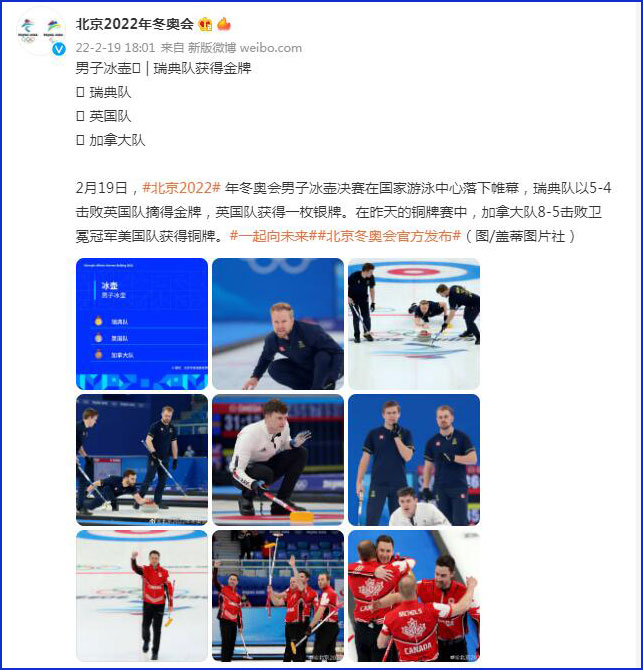 中工网讯 据北京2022年冬奥会和冬残奥会组织委员会官方微博消息,2月19日,北京2022年冬奥会男子冰壶决赛在国家游泳中心落下帷幕,瑞典队以5-4击败英国队摘得金牌,英国队获得一枚银牌。在18日的铜牌赛中,加拿大队8-5击败卫冕冠军美国队获得铜牌。