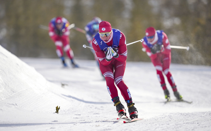 2月19日,俄罗斯奥委会选手亚历山大·博利舒诺夫(前)在北京冬奥会越野滑雪男子50公里集体出发(自由技术)比赛中。新华社记者牟宇摄