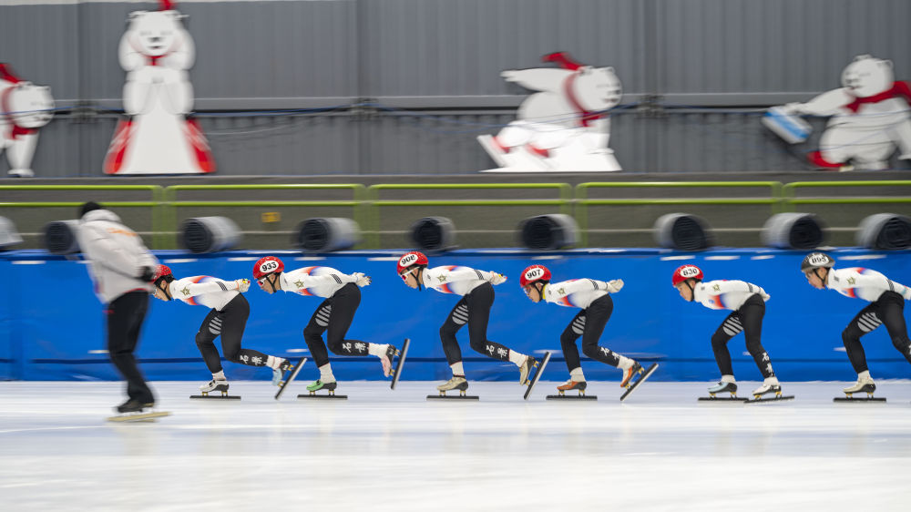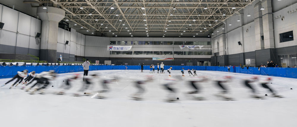 2月10日,在北京市昌平区世纪星国际冰雪体育中心,参加集训的小队员们进行短道速滑训练。
