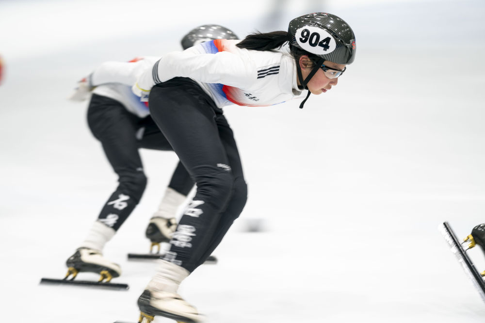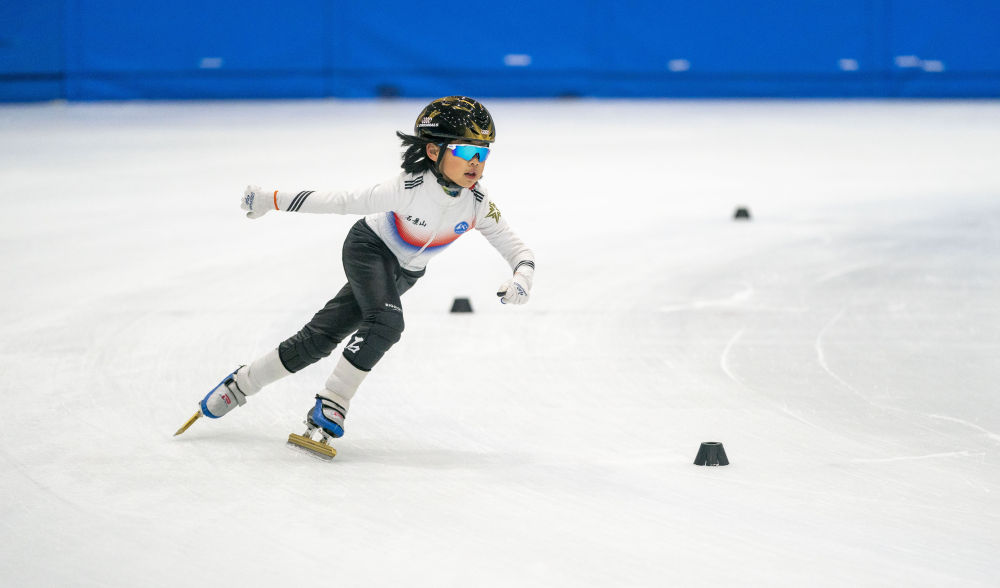 2月15日,在北京市昌平区世纪星国际冰雪体育中心,参加集训的小队员李铭慧进行短道速滑训练。