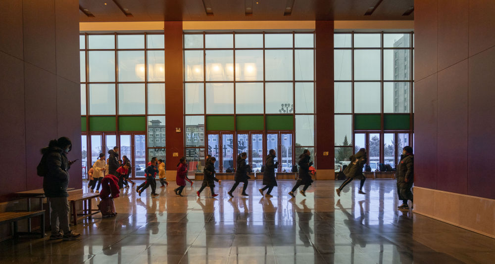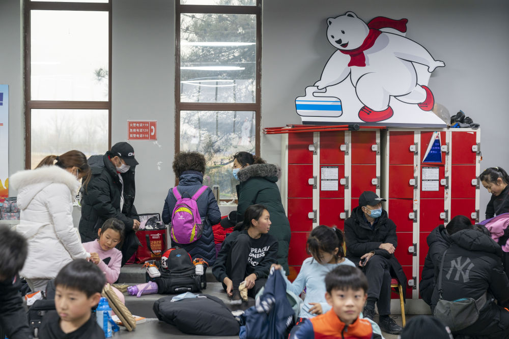 2月11日,在北京市昌平区世纪星国际冰雪体育中心,小队员们在训练结束后跟父母准备离开更衣室。