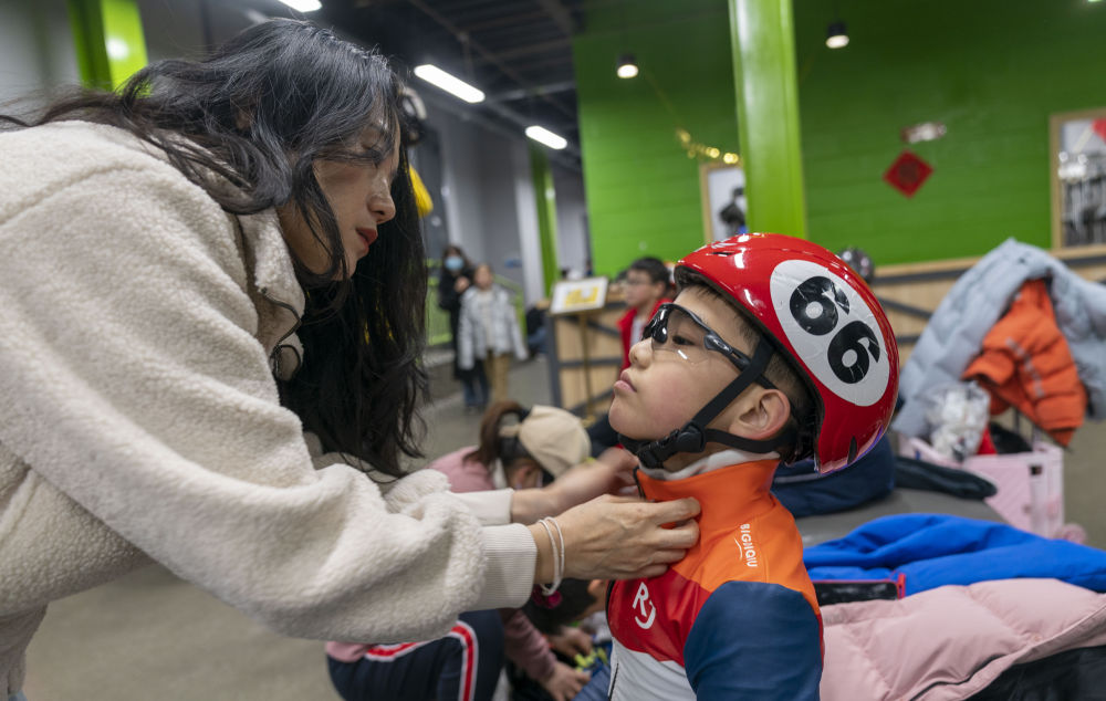 2月11日,在北京市昌平区世纪星国际冰雪体育中心,一名母亲帮孩子在上冰前系好头盔。