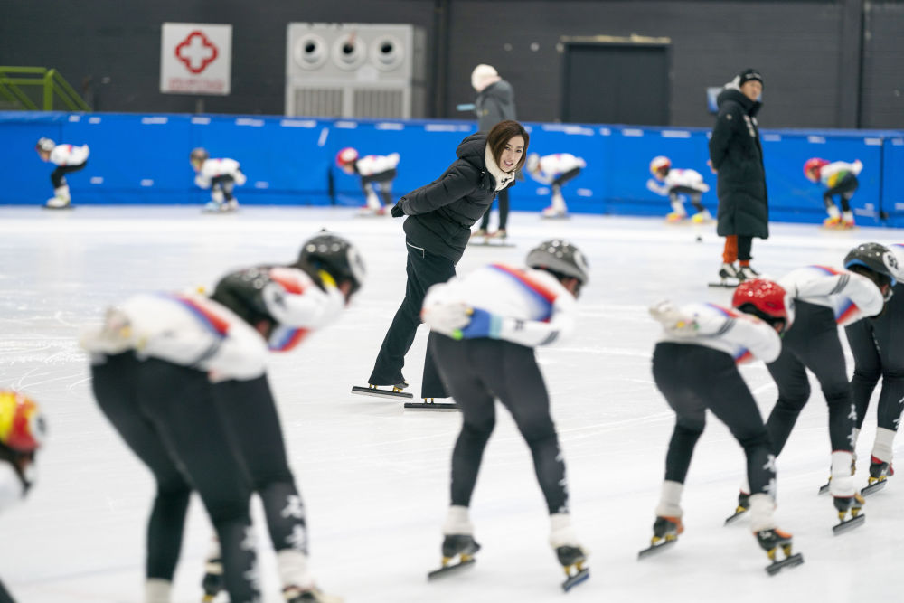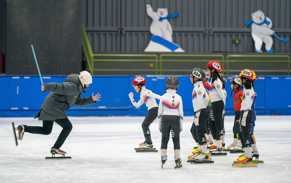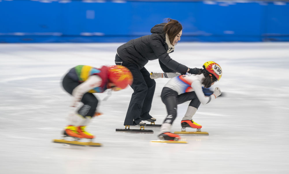 2月15日,在北京市昌平区世纪星国际冰雪体育中心,石景山区短道速滑主教练、短道速滑前世界冠军赵楠楠(中)指导小队员们进行训练。
