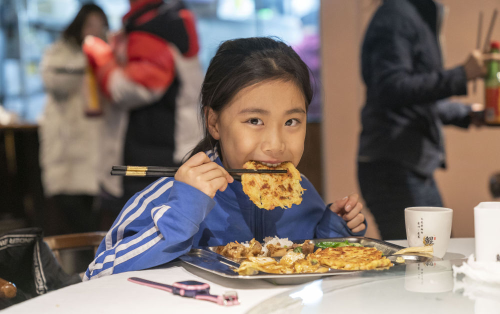 2月11日,在北京市昌平区集训驻地,参加集训的小队员周夏果在吃饭。