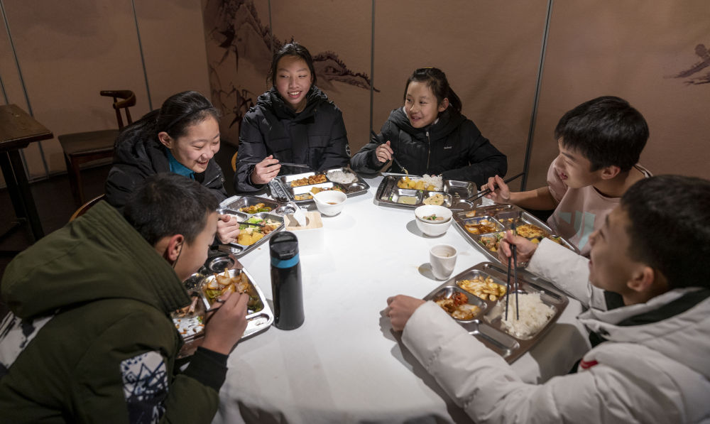 2月11日,在北京市昌平区集训驻地,参加集训的小队员们一起吃晚饭时有说有笑。