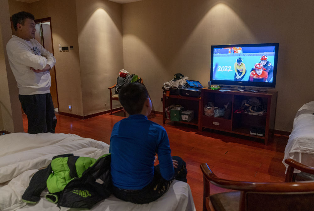 2月11日,在北京市昌平区集训驻地,参加集训的小队员魏荣彬(中)在观看冬奥会短道速滑比赛直播。