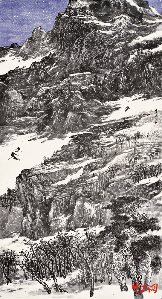 《雪在飞扬》(国画,尺寸123cm×226cm),作者李芳林,“冰雪情·冬奥梦”全国职工冰雪主题绘画活动优秀奖作品