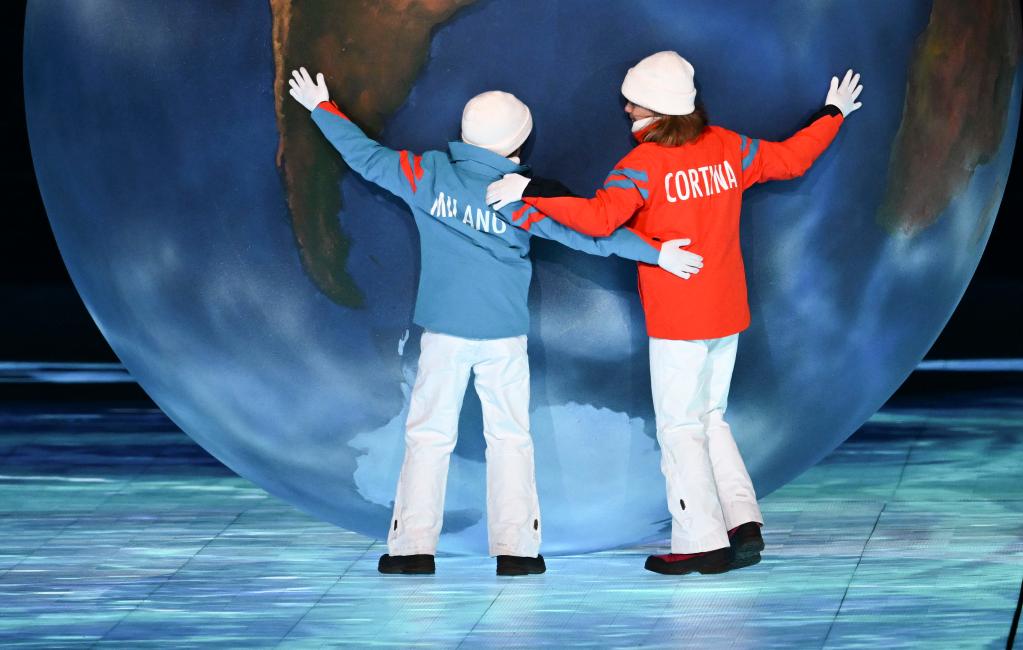2月20日晚,北京第二十四届冬季奥林匹克运动会闭幕式在国家体育场举行。图为下届冬奥会举办城市意大利米兰与科尔蒂纳丹佩佐文艺表演“双城璧合·聚力联辉”环节。新华社记者李尕摄
