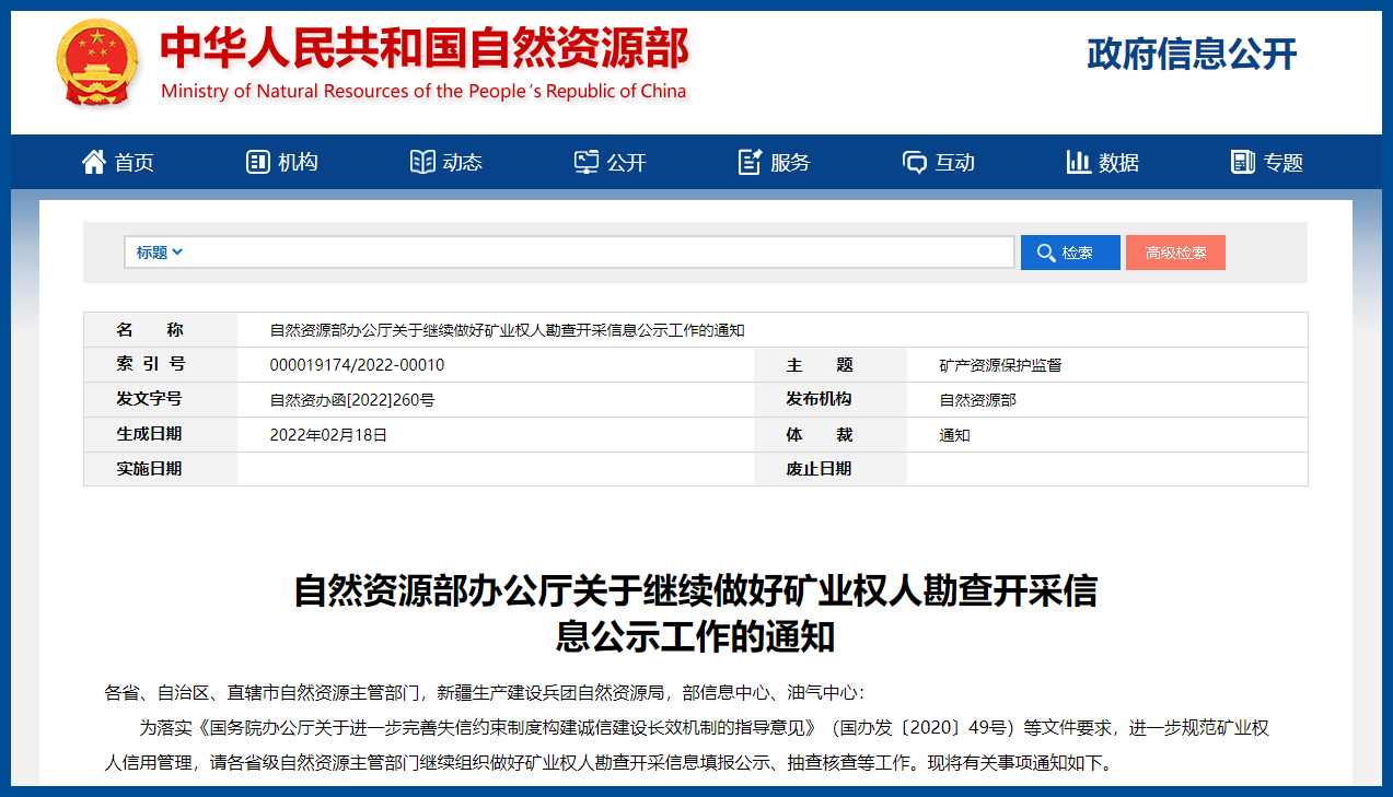 中工网讯 据自然资源部网站消息,为落实《国务院办公厅关于进一步完善失信约束制度构建诚信建设长效机制的指导意见》(国办发〔2020〕49号)等文件要求,进一步规范矿业权人信用管理,自然资源部办公厅公布《关于继续做好矿业权人勘查开采信息公示工作的通知》,全文如下: